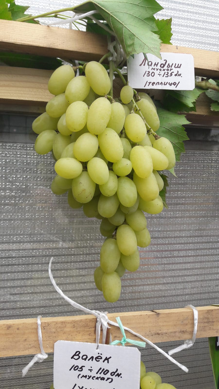 Добрый день. Вчера, в очередной раз, удалось принять участие на выставке виноградарей МКВ. Хорошая организация, много посетителей - настоящий праздник янтарной ягоды. Жаль только, что даже толком не удалось пообщаться с коллегами. Не успел повесить грозди на стенд, как окружили посетители - удивление,вопросы, восторг от увиденного. От каждой формы взял по грозди для угощения и, хотя угощал по ягодке, скоро оказалось мало, приходилось отрывать со стенда. Удачно оказалось, что на стенд повесил и фото нескольких кустов с улице. Очень наглядно работала и пара гроздей Ливии ( одна из теплицы, вторая с улицы).